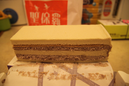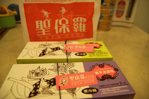 聖保羅烘焙坊是一家起源於嘉義的麵包店,得知可試吃,在網路上看了一下網站介紹,評價都很好,查了一下分店,台北有唯一的一家分店,便打電話去詢問,店員很有禮貌的問我姓名、預產期等基本資料後,約好了時間,店員說他們提供2條不同口味的蛋糕,剛開始想說有沒有聽錯,結果一到店取貨時,真的給了跟店家賣的一樣大小的蛋糕2條