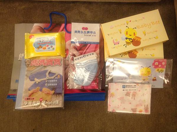 3份一之鄉餅乾共6包、紐約人壽手帕、美商永生襪子、S-26濕紙巾