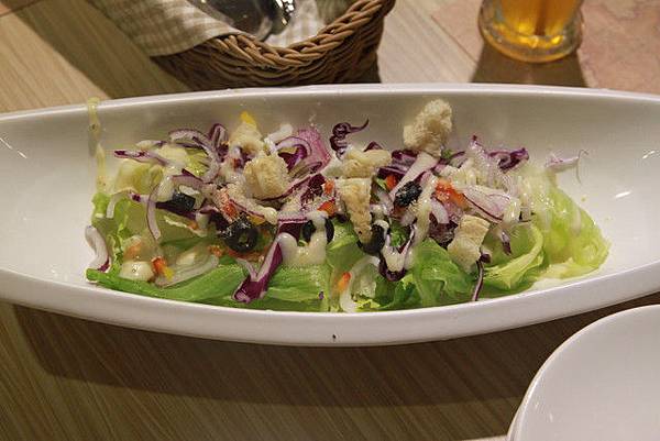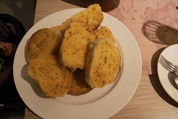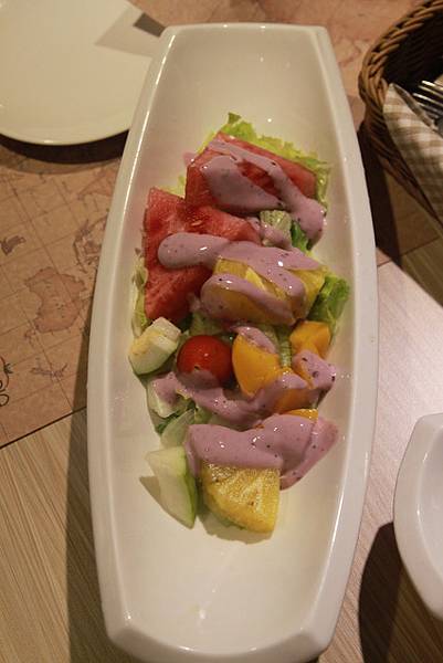 剛開始來了四樣餐點,南瓜濃湯普通,蔬菜沙拉及水果沙拉,水果一點也不好吃,香蒜麵包還可以