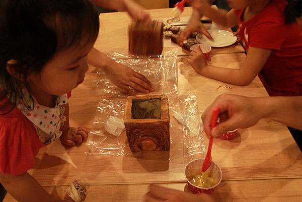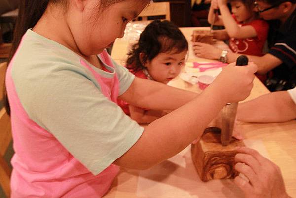 把奶油塗滿裡面的麵包及灑糖粉,挖出來的切塊,再拿去烤,安很專心耶~
