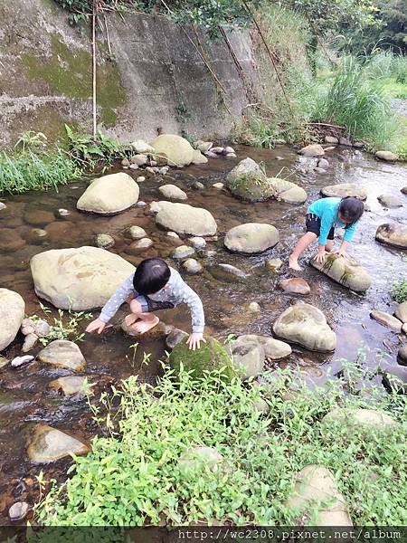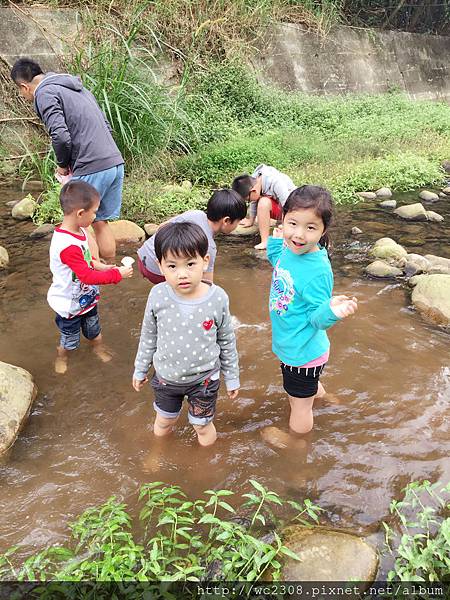 下午和大家一起去營區旁的小溪抓魚,有好多小魚,但都很靈敏,很難抓,只好玩玩水,這樣也是很開心